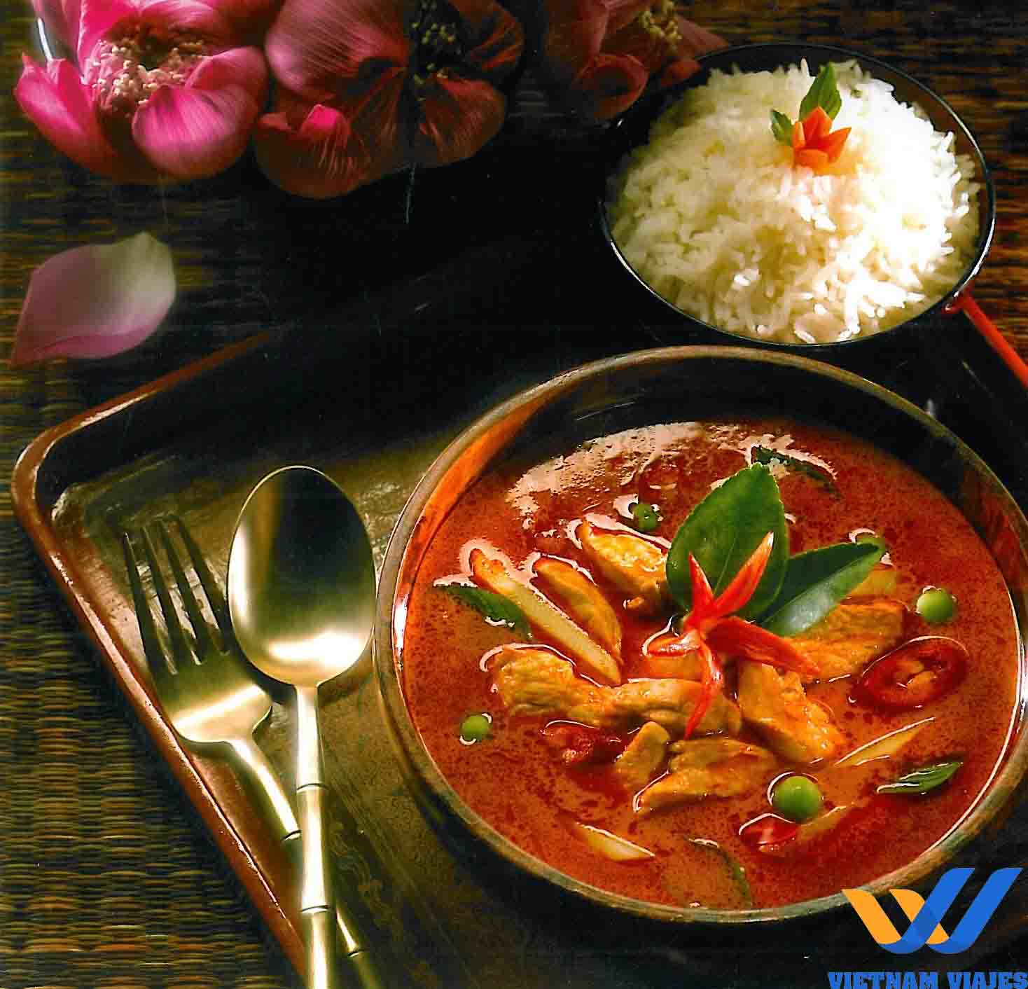El curry jemer se sirve generalmente con carne de res, pollo o pescado y se condimenta principalmente con leche de coco fresca, hierba de limón y salsa kroeung. Khmer Curry es un sabor de curry único que solo se puede degustar en Camboya.